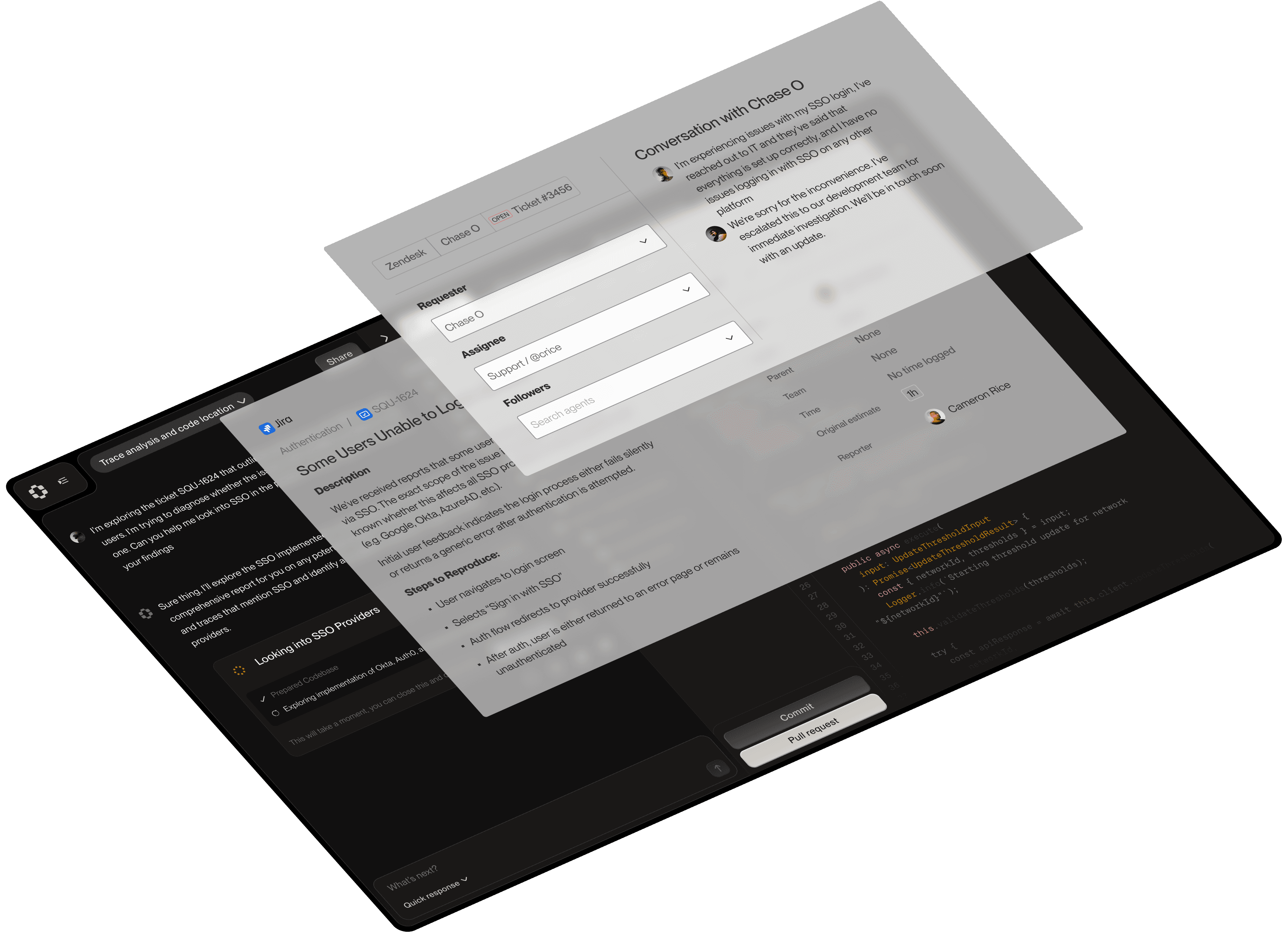 A holistic and context-aware understanding of your product across code, tickets, telemetry, and documentation. PlayerZero continuously reinforces its understanding of your product based on what's happening outside of the editor.